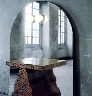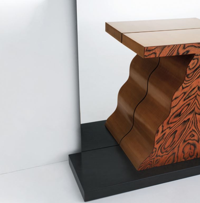 Зеркальный блок с хрустальным зеркалом, двумя накладками и консолью из груши и шпона альпи. Основание из дерева, покрытого анилиновым лаком. Каждая часть обозначена прогрессивной нумерацией.