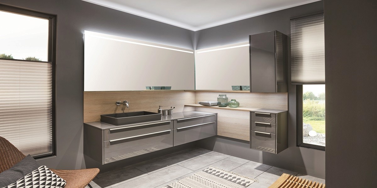 Мебель для ванной комнаты Lux. Практичная и элегантная мебель для ванной комнаты в стиле минимализма. МДФ, лак, глянцевые фасады и корпус мебели - цвет "серый сланец". В серии 6 цветов лака. Шкафы под раковину, нижние шкафы с выдвижными ящиками для планирования интерьера ванной комнаты в 4х вариантах высоты. В серии: накладная раковина, влагоустойчивая столешница, смеситель для раковины, встроенная подсветка.