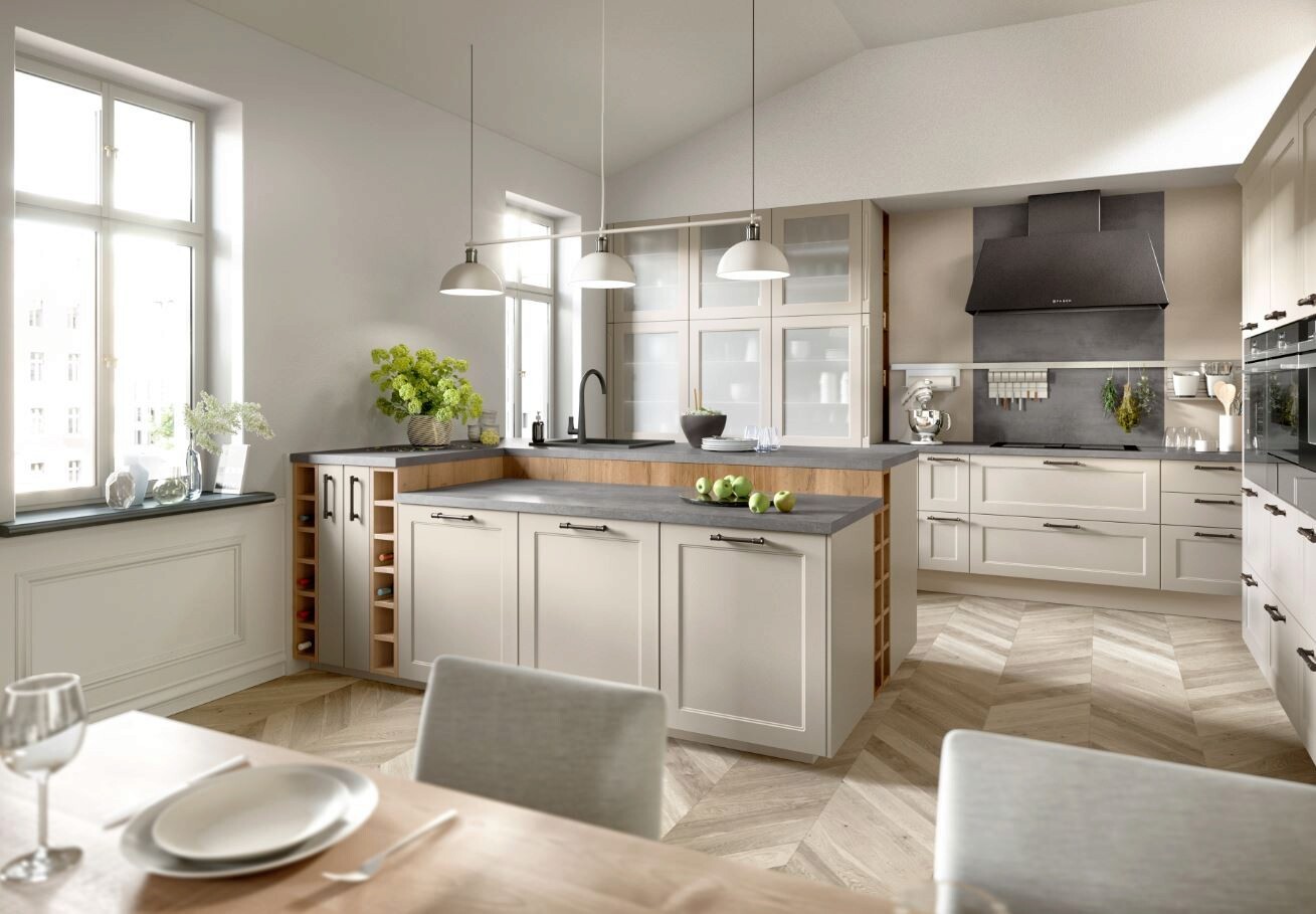 Кухня Chalet. Ценовая категория 9. Роскошная кухня для дворцовых и неоклассических интерьеров. Белые фасады с утопленной филенкой, МДФ, матовое лаковое покрытие, в серии всего 3 цвета лака. Варианты: стеклянная дверь с фасетом по периметру в традиционной раме или с отделкой рейками. Дополнительные элементы: карниз, резные пилястры. Столешницы: 38 вариантов декора.Ручки: 45 видов ручек, в том числе, из дерева, в винтажном стиле, с патинированной поверхностью.