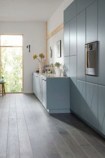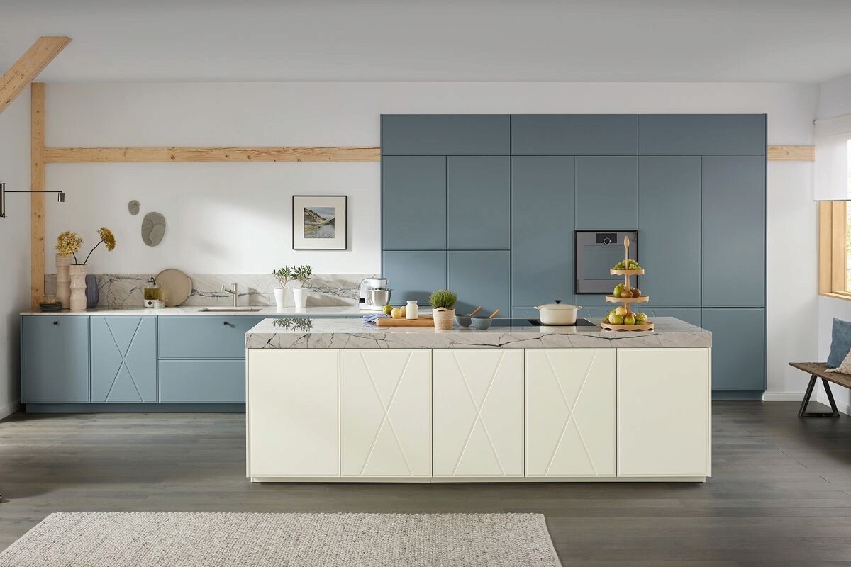 VILLA S 46150 - УЮТНАЯ ЛЁГКОСТЬ – ТИХОЕ МЕСТО ДЛЯ ОТДЫХА. Fehgrau (туманно-серый) навевает спокойную элегантность классических шведских домов. Северная эстетика всегда восхищала своим гармоничным сочетанием традиционных элементов и современной ясности. Дизайнерские двери Cross Elements становятся визуальной изюминкой в классической планировке. Открытый кухонный остров в премиум-белом вносит светлый, воздушный контраст и отражает типичную скандинавскую цветовую гамму. Особенно практичен новый надстройный шкаф с подъемной дверцей, расположенный прямо на рабочей поверхности — идеальное место для Thermomix или другой кухонной техники. Внутренняя организация построена на выдвижных элементах и ящиках LEGRABOX pure WOOD из светлого дуба. Лотки для столовых приборов и разделители для специй из светлого дуба гармонично дополняют этот ясный стиль благодаря качественным материалам.