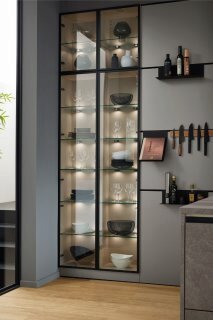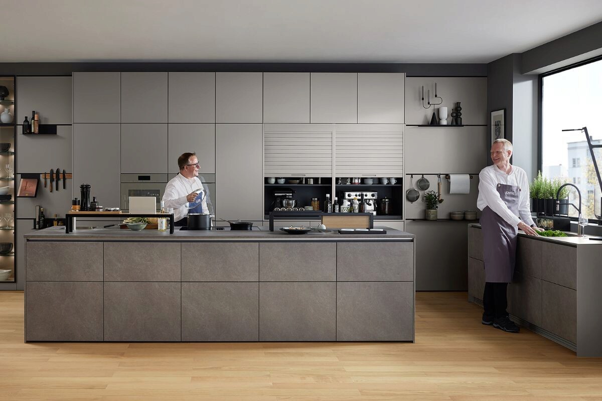 Остров в эксклюзивном стиле BLACKLINE под тёмный песчаник с огромной рабочей поверхностью — идеальная площадка для кулинарных шедевров. Бесконтурные высокие и нижние шкафы оснащены внутренними выдвижными ящиками LEGRABOX pure WOOD. За дверями с алюминиевым профилем посуда эффектно выставлена напоказ и всегда готова к использованию. В профессиональной кухне ничего не оставляют на волю случая. Всё организовано так, чтобы повара могли работать быстро и точно. Максимальную свободу обеспечивают мобильные FREEMOBILE LAFER by Ballerina-Küchen с съёмной разделочной доской и контейнерами. Специи и ингредиенты всегда в непосредственной близости от рабочей зоны. Для крупных инструментов рекомендованы жалюзийные шкафы с выдвижными полками. Они также подходят в качестве кофейного бара для перерыва между блюдами или для хранения техники. Особенный акцент — шкаф для Thermomix, который одним движением поднимает технику, фиксируется и обеспечивает безопасную рабочую поверхность. Мусорная система LAFER by Ballerina-Küchen интегрирована вровень с рабочей поверхностью: овощные и фруктовые отходы легко сдвигаются в мусорное ведро. Обычная сортировка отходов также осуществляется прямо со столешницы в специальный ящик «MUPL». Среди других достоинств — бокс для свежих продуктов, охладитель «LAFER by QOOL» и нижний шкаф для гастроёмкостей, чтобы правильно хранить продукты в рассыпном виде. Для специй Lafer предусмотрены специальные вставки в ящиках и системе FREEBRIDGE. Для свежих трав есть специальные выдвижные модули, а для хлеба — идеальное место хранения.