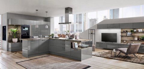 Легкая современная кухня с ультраглянцевыми фасадами цвета «альпийский белый». Фасады, боковые стенки и полки выполнены в технике постформинг, покрытие: УФ-пленка и глянцевый лак. Всего в серии Flash 4 цвета фасада. Лаконичные формы Flash гармонично сочетаются с акцентными отделками для навесных шкафов, столешницы и открытых секций Color concept с фактурой натурального мрамора и других пород камня, балочного дуба. Кухня Flash поставляется в трех вариантах фасадов: с накладными ручками, профильными ручками, а также в формате Line N - без ручек. Доступна прямая, угловая, п-образная или параллельная планировка кухни, а также кухня с островом. Столешницы: 42 варианта декора плюс 4 цвета для сверхпрочной рабочей поверхности Xtra. Ручки: 85 вариантов ручек.