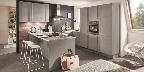 Кухня StoneArt 304. Ценовая категория 4. Модульная кухня в современном стиле для урбанистов и ценителей эффектных решений. Фасады и корпус с оптикой и фактурой натурального камня светлых тонов декорированы высокотехнологичным слоистым материалом. Исполнение фасадов Line N - кухня без ручек. Удачно смотрится светлый рисунок камня в комбинации с деревянными фасадами медовых, коньячных и карамельных оттенков Riva, Structura. Доступна прямая, угловая, п-образная или параллельная планировка кухни, а также кухня с островом. Столешницы: 38 вариантов декора.