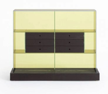 Серия стеклянных комодов с каркасом из прозрачного цветного ламинированного стекла, склеенного УФ-излучением с основанием и ящиками из натурального затемненного массива ясеня, обработанного термообработкой. Сверхлегкие стеклянные полосы, приклеенные к боковым сторонам мебели, выступают в качестве «невидимых» направляющих для ящиков, которые остаются полностью видимыми благодаря углубленным пазам по бокам. В результате получаются предметы с изысканным техническим решением, высокой эстетической и формальной ценностью. Доступны в монохромном исполнении из стекла или в варианте с задней стенкой другого цвета. Под основанием расположены колесики для удобного перемещения.