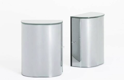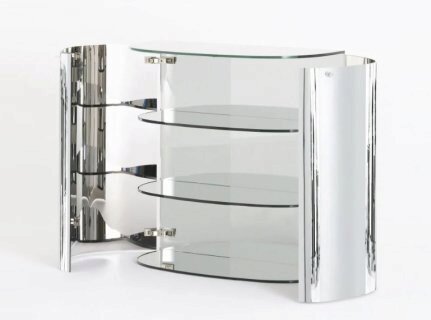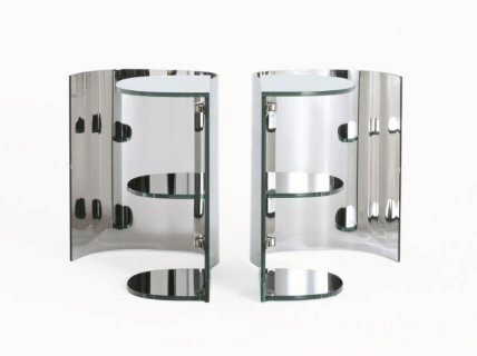 Стеллажные модули из специального зеркального стекла с плавными изогнутыми формами. Конструкция выполнена из ламинированного стекла толщиной 6+6 мм, полностью зеркального как внутри, так и снаружи. Двери изготовлены из изогнутого и закаленного двустороннего зеркального стекла толщиной 6 мм, отличающегося искаженными и нечеткими отражениями, что придает материалу неуловимый и оптически текучий вид. Двери оснащены системой плавного закрывания Blumotion и открываются с помощью цилиндрических стеклянных ручек .