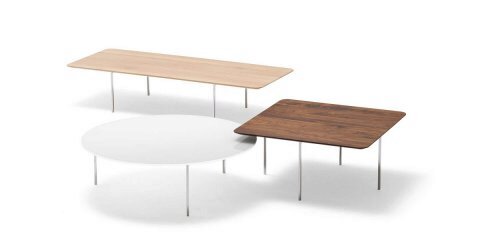 В случае со столом Sting это подразумевается в самом буквальном смысле. Самые маленькие столешницы имеют самую высокую раму, средние — средней высоты, а самые большие — самую низкую. Это позволяет красиво штабелировать столы, создавая в общей сложности 3 высоты и 7 форм.