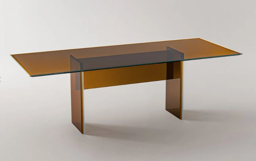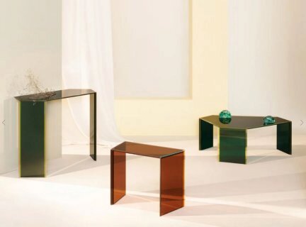 Коллекция высоких, низких столиков и консолей, изготовленных из многослойного и многоцветного стекла, созданного путем ламинирования пяти пластин сверхлегкого стекла толщиной 5 мм, каждая из которых покрыта пленкой разного цвета. Полученные листы стекла имеют различную форму, отшлифованы до блестящего состояния и «гранены» с помощью уникальных фасок, подчеркивающих благодаря прозрачности стекла потрясающий многоцветный материал. Затем различные компоненты свариваются вместе с абсолютной прозрачностью с помощью специальной техники склеивания, создавая таким образом очень ценные «мебельные украшения».