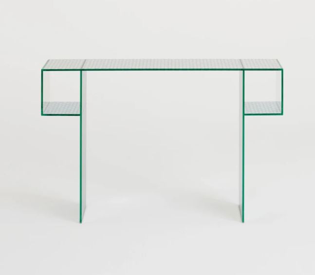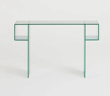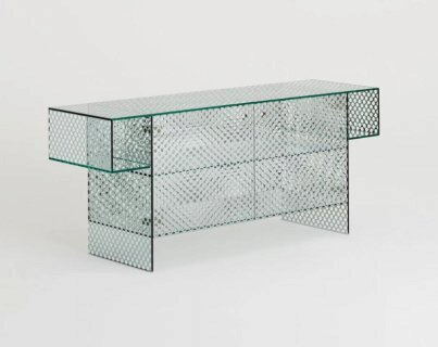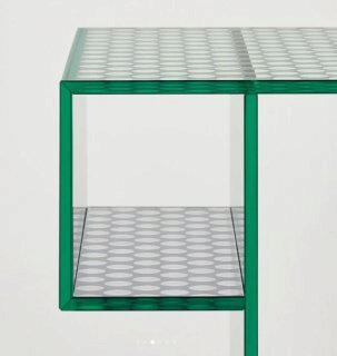 Коллекция низких столиков, консолей и мебели для хранения, полностью изготовленная из специального двустороннего зеркального стекла с декоративным узором из круглых прозрачных меток, имитирующих перфорированный металлический лист. Все стекло закалено и склеено УФ-защитным покрытием. Две дверцы открываются и закрываются с помощью системы «нажать-потянуть».