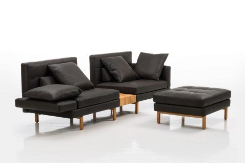 Design Roland Meyer-Brühl. Amber представляет собой комплексное программное планирование и многовариантно изменяемое жилое устройство: плавно опускающиеся подлокотники и спинки, мягкая стеганая поверхность и видимые геометрические структуры. Здесь представлен роскошный 2,5-местный диван, обитый бархатистой кожей цвета коньяка, с низкими подлокотниками. Каркас: хромированные полозья угольной формы, в качестве альтернативы – деревянные полозья. Подлокотники по желанию устанавливаются вверху или внизу.